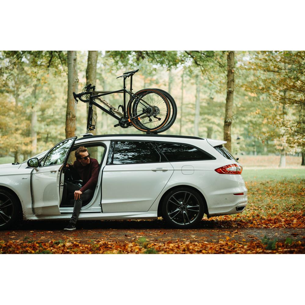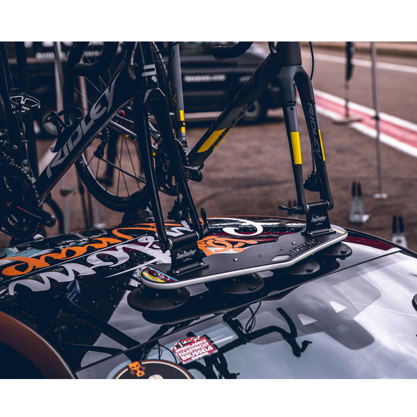 Je zet de fiets op de SeaSucker dakdrager, je zet de voorvork vast zoals je normaal gesproken je voorwiel vastzet en je zet het achterwiel vast met de los meegeleverde cup. Even controleren of alles goed vast zit en je kan vertrekken!
